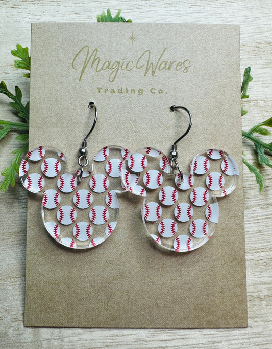 Baseball Mouse, Mouse head Laser cut Baseball Patterned Crystal Acrylic Earrings, Handmade earrings, Glowforge Earrings