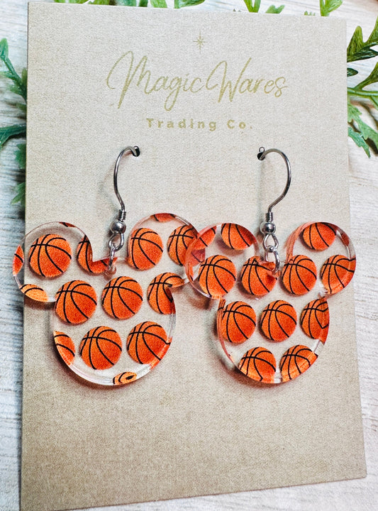 Basketball Mouse, Mouse head shaped Dangle Earrings, Laser cut Basketball Patterned Crystal Acrylic, Handmade earrings, March Madness