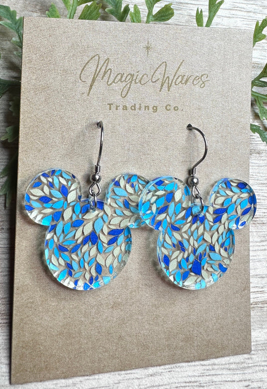 Beach Confetti Mouse, Laser Cut, Blue Floral Crystal Acrylic Earrings, Dangle Earrings, Made to order, Glowforge Earrings