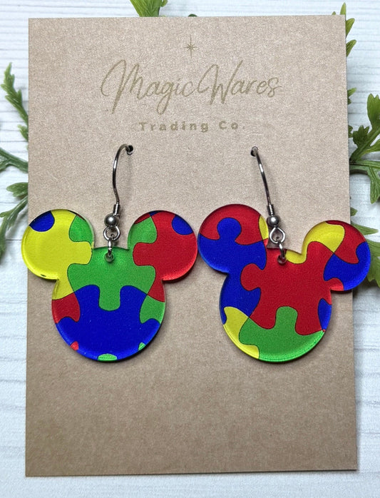 Autism Awareness Puzzle Pattern Mouse head shaped dangle earrings, Laser cut Acrylic Earrings Autism Puzzle pattern crystal acrylic