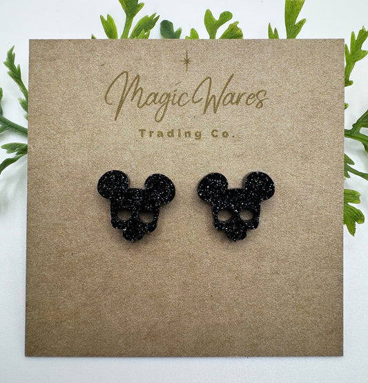 Black Glitter Skull Stud, Laser cut Post Earrings, Pierced Earlobe, Stainless Steel Post earrings, Villains earrings, Halloween stud earring