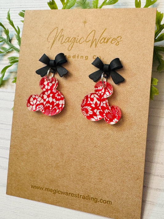 Black Bow and Red Lace Mouse Head Laser cut Dangle Earrings, Red Lace Patterned Crystal Acrylic, Valentines Day Earrings