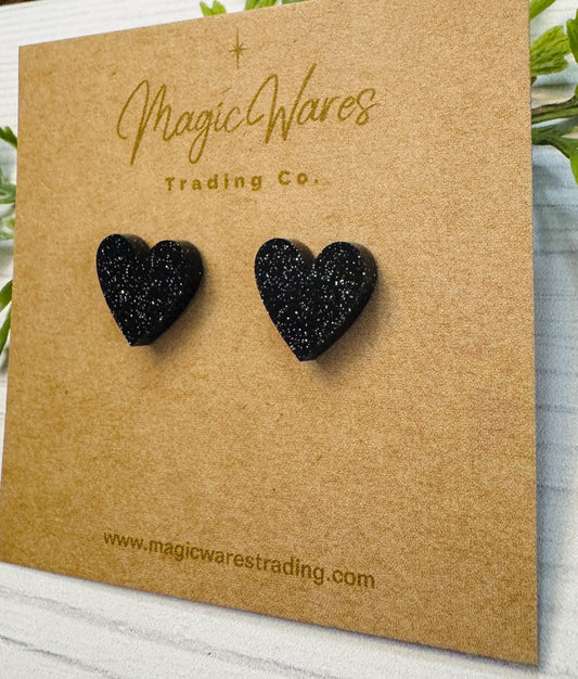Black Glitter Heart Stud Earrings, Laser Cut Black Glitter Post Earrings, Pierced Earlobe Glitter Valentines Day earrings hypoallergenic