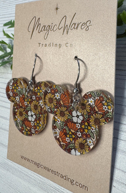 70s Floral Mouse Head Dangle Earrings, Laser Cut Acrylic Dangle Earrings, Retro Floral patterned Earrings, Dangle Earrings