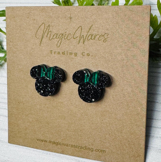 Black Glitter Mouse head Stud Earrings with Striped Bow, Ghost Host Green and Black striped bow Stud earrings, Clip ons available