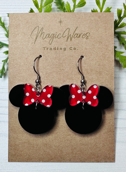 Polka Dot Minnie Bow Dangle Earrings, Laser cut Black Acrylic Earrings handmade polk dot bow black earrings