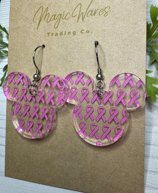 Pink Ribbon Mouse Head Dangle Earring, Laser Cut Pink Ribbon Pattern Crystal Acrylic, Breast Cancer Awareness earrings
