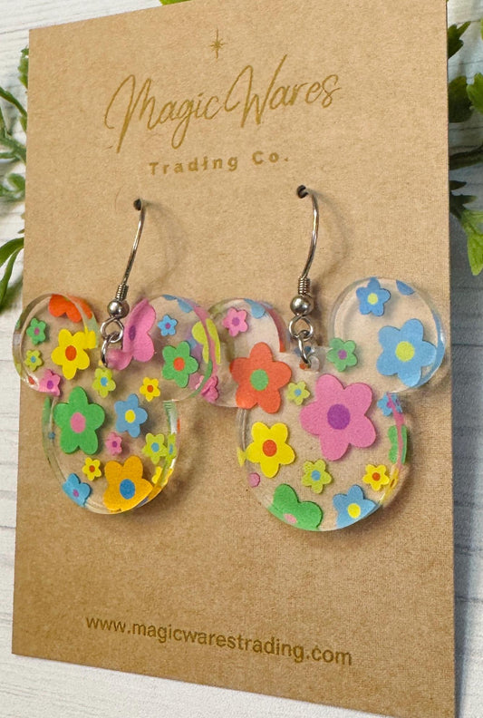 POP Century Floral Mouse Dangle Earrings, Bright Floral patterned Crystal Acrylic Earrings, Spring Earrings, Gifts for Mom