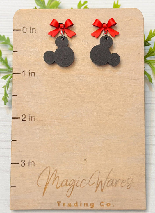 Purple Bow with Black Mouse Head Dangle Earrings, Laser Cut Acrylic and Stainless Steel Stud Earrings, Minnie inspired earrings