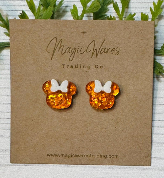 Pumpkin Spice Orange Glitter Mouse Stud Earrings with Black Bow, Clip ons available