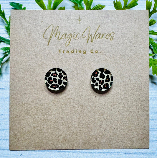 Round Leopard Stud Earrings, Laser Cut Post Earrings Pierced Earlobe Leopard Print on Crystal Acrylic