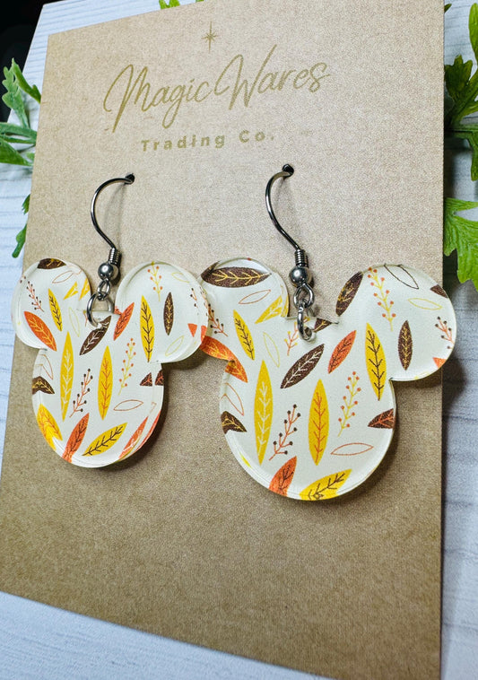 Fall Leaves Mouse head Earrings, Laser Cut Fall patterned Crystal Acrylic Earrings, Dangle Earrings Fall Earrings