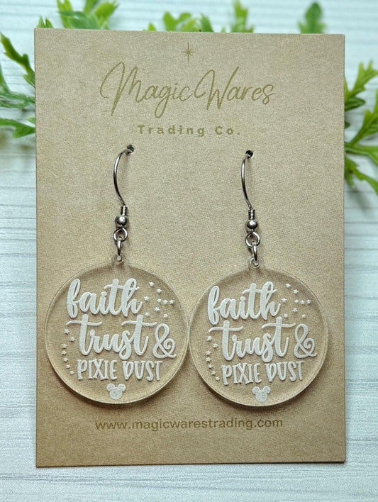 Faith Trust and Pixie Dust Engraved Dangle Earrings, Clear acrylic engraved earrings, Tinkerbell inspired earrings, Pixie Hollow earrings