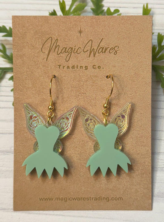 Fairy Dress Dangle Earrings, Iridescent acrylic engraved Fairy Wing earrings, Tinker Bell inspired earrings, Pixie Hollow earrings