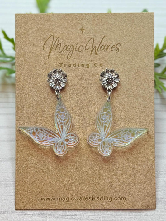 Fairy Wings Dangle Post Earrings, Iridescent acrylic engraved Fairy Wing earrings, Tinker Bell inspired earrings, Flower Stud earrings