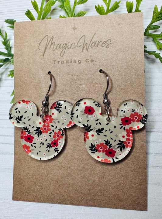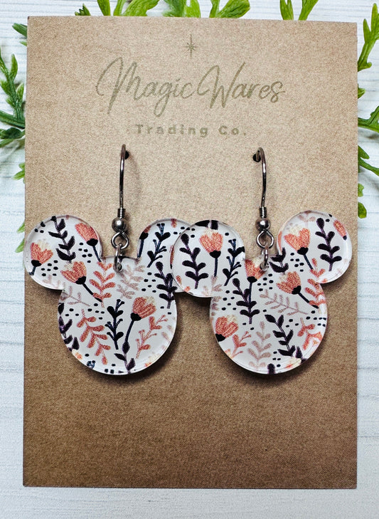 70s Floral Mouse Head Dangle Earrings, Laser Cut Acrylic Dangle Earrings, Retro Floral patterned Earrings, Dangle Earrings