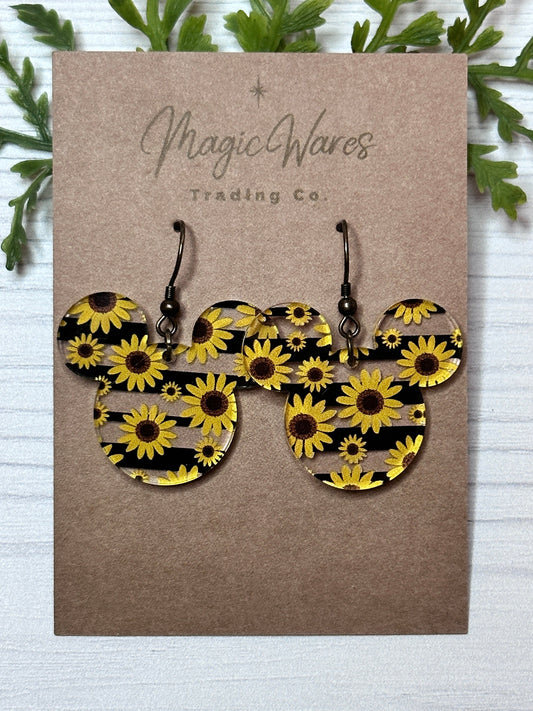 Sunflower Stripe Mouse Earrings Laser Cut Sunflower with Black stripe patterned Crystal Acrylic Earrings, Dangle Earrings Fall Earrings