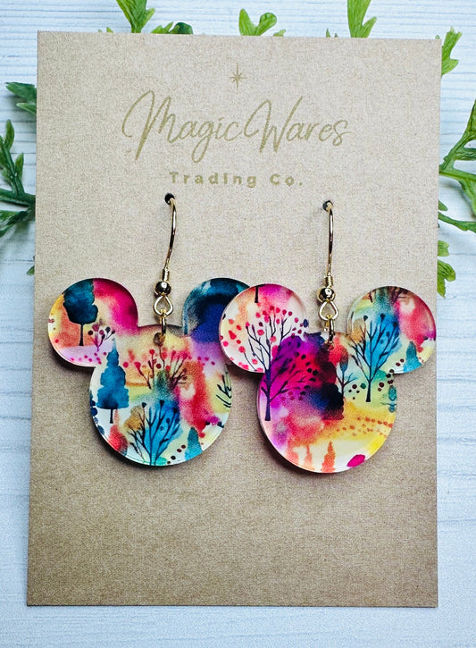 Watercolor Trees Laser Cut Dangle Earrings , Abstract Watercolor Trees patterned Crystal Acrylic Earrings Dangle Earrings Autumn Earrings
