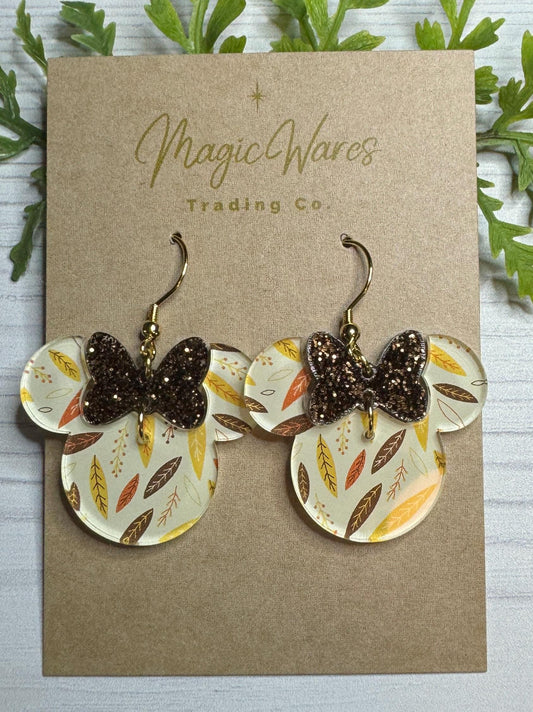 Fall Leaves Minnie Bow Dangle Earrings, Laser cut Acrylic with Brown Glitter Bow, Fall Earrings, Fall Floral earrings
