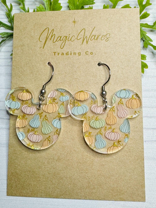 Pastel Pumpkins and Gourds Mouse head Earrings, Laser Cut Pumpkin patterned Crystal Acrylic Earrings, Dangle Earrings Fall Earrings