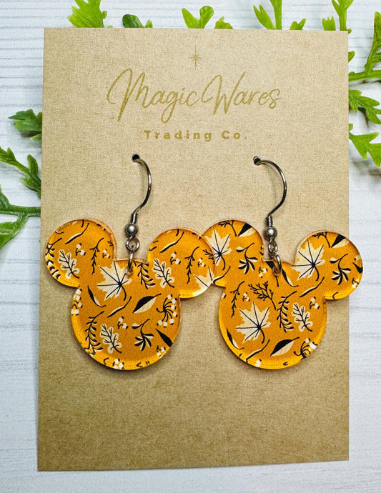 Golden Autumn Mouse head Earrings, Laser Cut Fall Foliage patterned Crystal Acrylic Earrings, Dangle Earrings Fall Earrings