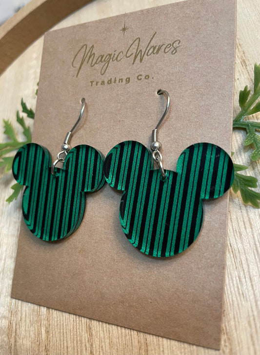 Foolish Mortal Engraved Dangle Earrings, Laser Cut Green and Black Striped patterned Crystal Acrylic Earrings, Dangle Earrings HM inspired