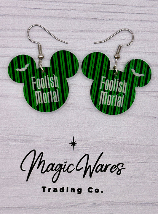 Foolish Mortal Wood Oval Earrings, Laser Cut Walnut and Engraved Acrylic Dangle Earrings Halloween Earrings, Haunted Mansion Earrings