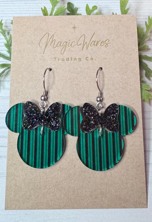 Haunted Minnie, Black Glitter Bow Dangle, Laser cut Green and Black Acrylic Earrings, Haunted Mansion inspired