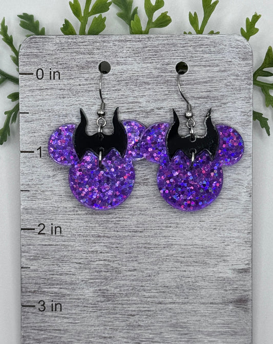 Mistress of Evil Dangle Earrings, Laser cut Holographic Purple Glitter Acrylic Earrings with black horns, Villians Earrings Halloween party