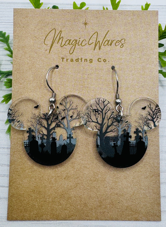 Haunted Graveyard Mouse Laser cut Dangle Earrings, Crystal Acrylic Earrings Halloween earrings, Not so scary Halloween Party earrings