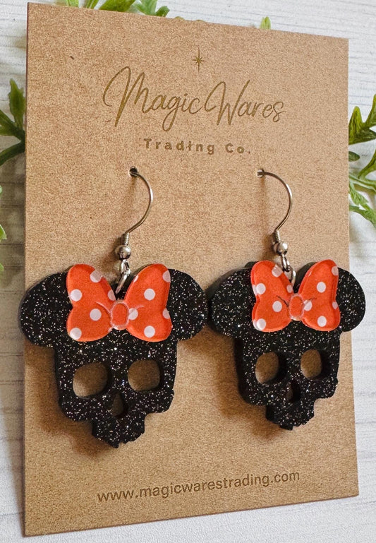 Minnie Skull Black Glitter Acrylic Earrings, Orange Polka Dot Bow Mouse Skull Dangle Earrings, Halloween Earrings Black Skull Earrings