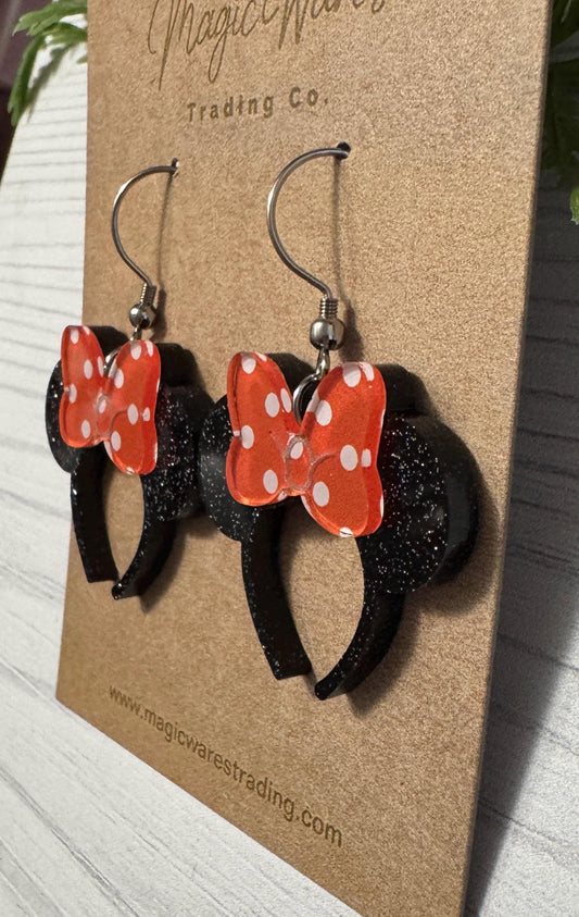 Minnie Black Glitter Headband Ears Dangle Earrings, Orange Polka Dot Mouse ears headband, Halloween Earrings, Mouse Ears Dangle Earrings