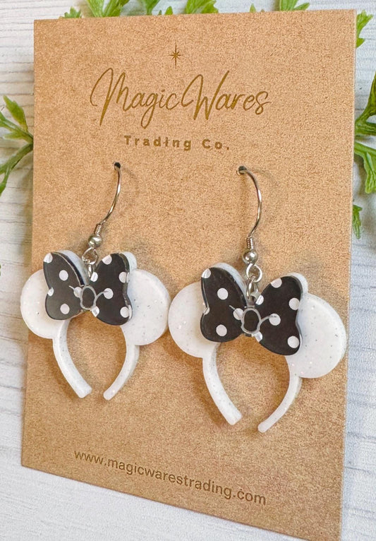 Minnie White Glitter Headband Ears Dangle Earrings, Black Polka Dot Mouse ears headband, Glitter Mouse Ears Dangle Earrings