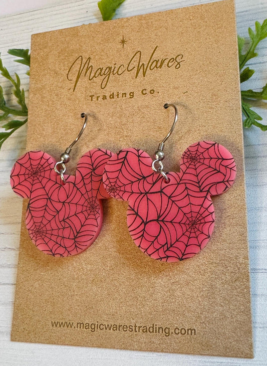 Pink Spiderwebs Laser cut Mouse head Dangle Earrings, Spiderweb Pattern Crystal Acrylic Halloween earrings, Not So Scary Halloween Party