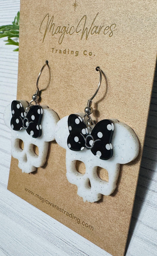 Minnie Skull White Glitter Acrylic Earrings, Black and White Polka Dot Bow Mouse Skull Dangle Earrings, Halloween Party Earrings
