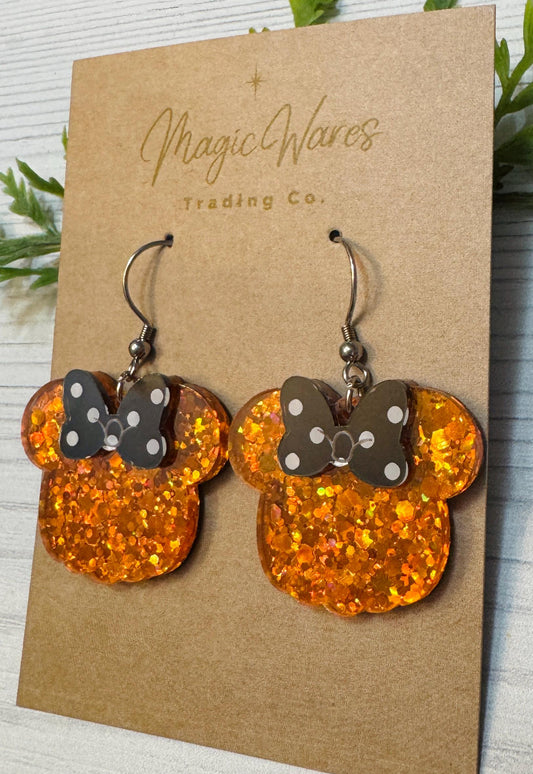 Pumpkin Sparkle Mouse Dangle Earrings, Black Polka Dot Bow Earrings, Orange Glitter Lightweight Acrylic Earrings, Halloween Pumpkin Earrings