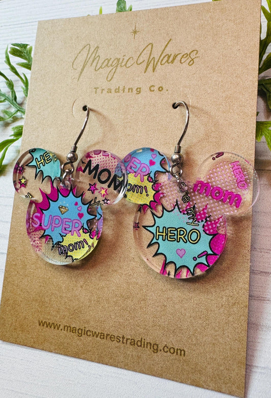 Super Hero Mom Mouse Head shaped Acrylic Earrings, Super Hero pattern Acrylic Dangle Earrings, Mothers Day Earrings, Gifts for Mom
