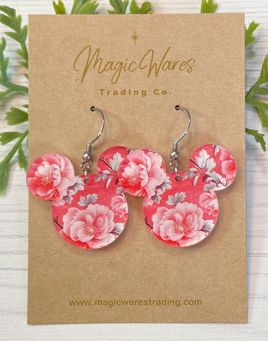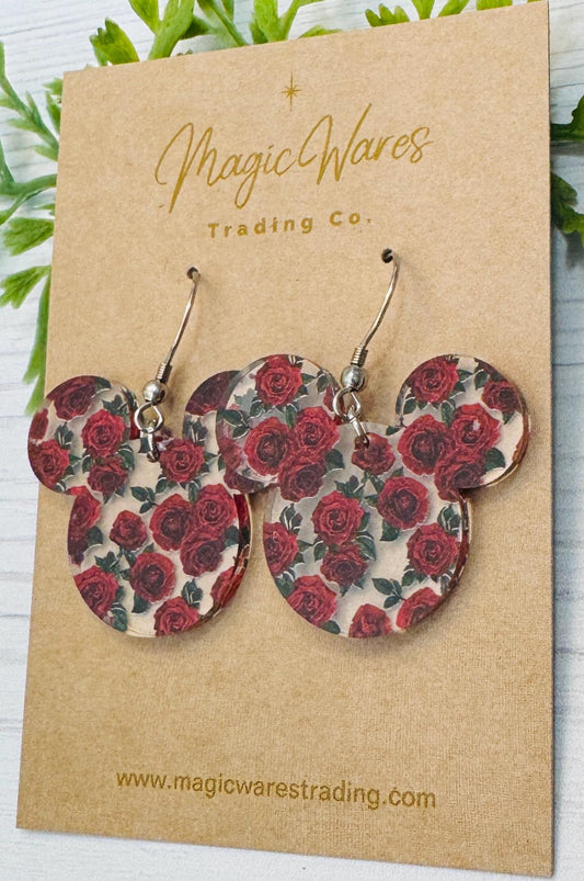Red Roses Mouse Head Laser Cut Earrings, Red Roses Patterned Acrylic Dangle Earrings, Gifts for Mothers Day, Valentines Earrings