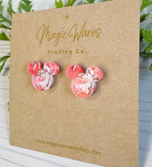 Pink Roses Mouse Stud, Laser cut Acrylic Earrings Pierced earlobe, Surgical Stainless Steel earrings, Clip on Earrings, Gift for Mothers Day