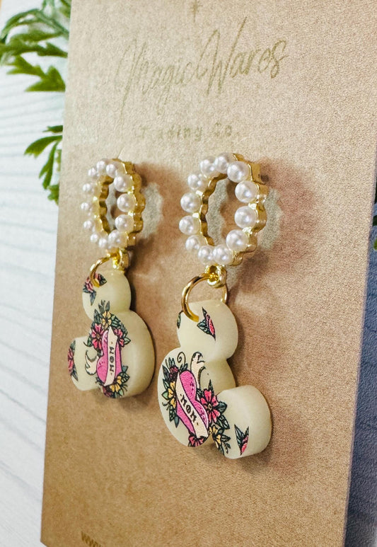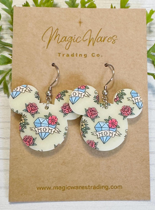 Mom Tattoo Mouse Head shaped Acrylic Earrings, 3 styles of Mothers Day Earrings, Mom Heart Tattoo pattern on Ivory Acrylic, Gifts for Mom