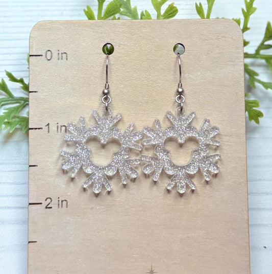 Glitter Snowflake Mouse Dangle Earrings, Silver Shimmer Glitter Acrylic Earrings, Christmas Earrings, Very Merry Christmas Party earrings