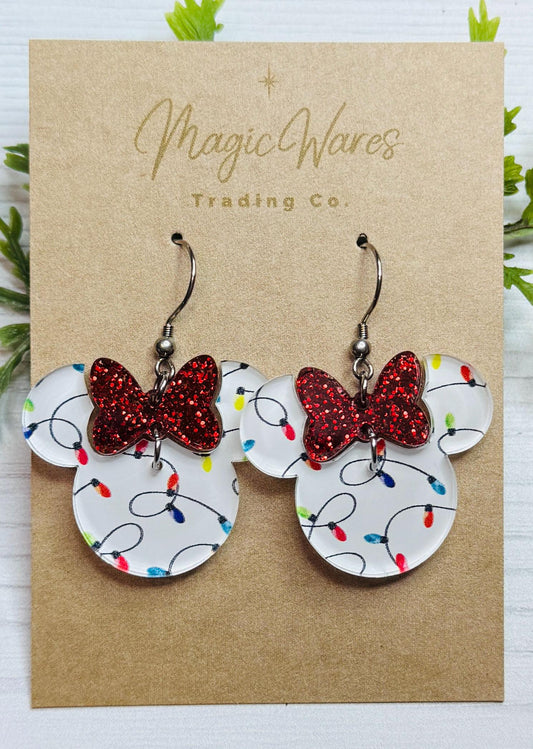 Christmas Lights Minnie Glitter Bow Dangle Earrings, Laser cut Acrylic 2 Part Minnie Dangle earrings, Very Merry Christmas earrings