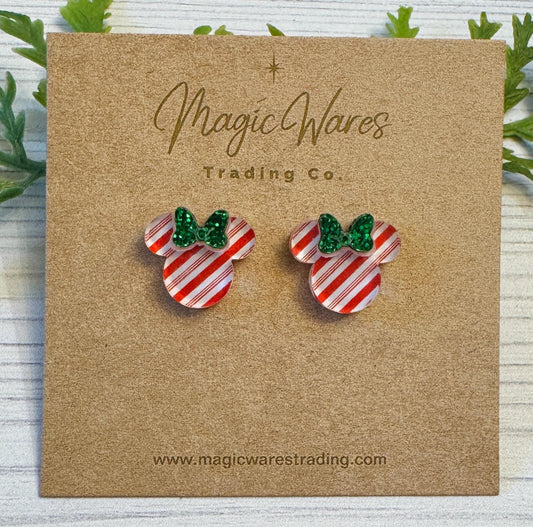 Candy Stripe Stud Earrings with Green Glitter Bow, Mouse Head Glitter Bow Studs, Candy Cane Stripe Earrings, Clip ons available