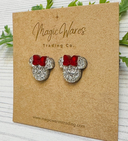 Silver Glitter Stud Earrings with Red Marble Bow, Mouse Head Bow Studs, Minnie inspired Post Earrings, Clip ons available