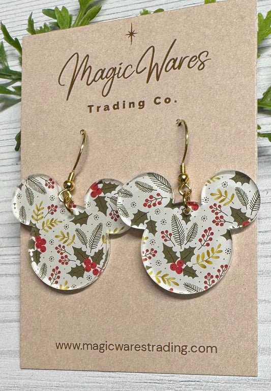 Evergreen and Holly Berries Mouse Laser Cut Earrings