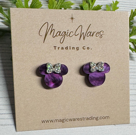 Purple Marble Swirl Mouse Stud Earrings with Iridescent Silver Bow, Clip ons available