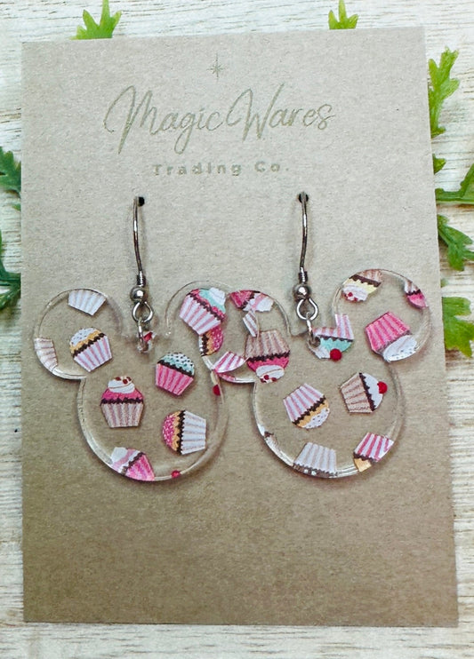 Cupcake Mouse, Laser Cut Dangle Earrings , Cupcake patterned Crystal Acrylic Earrings, Dangle Earrings, Made to order, Birthday Earrings
