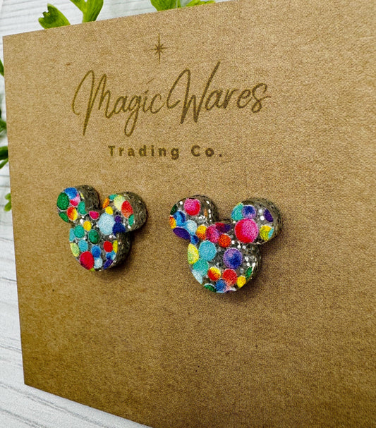 Rainbow dot glitter Mouse Stud, Rainbow Dot printed pattern on a silver glitter acrylic, pierced earlobe post earrings
