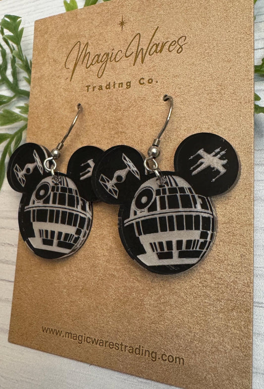 Dark Side Mouse head Laser cut Acrylic Earrings, Death Star inspired Dangle earrings, May the Fourth Earrings, Darth Vader Earrings