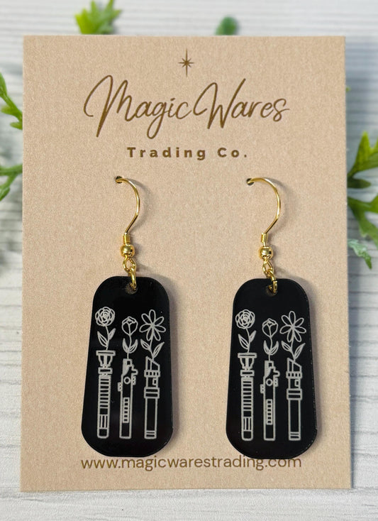 Floral Lightsabers Dangle Earrings, Laser Engraved Acrylic Dangle Earrings, Black engraved Lightsaber acrylic earrings, Star Wars inspired